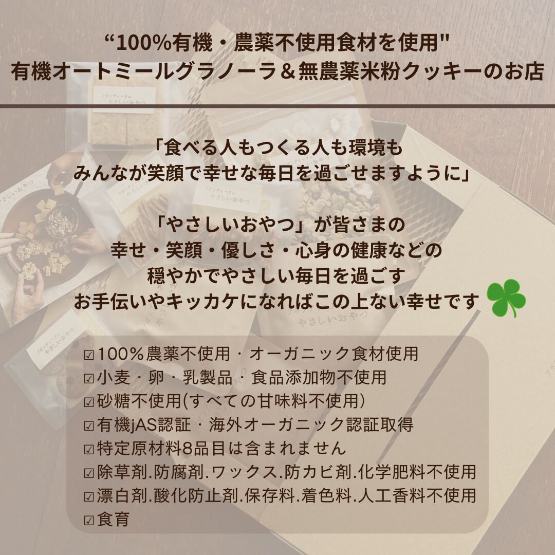 【原材料名】:有機オートミール(有機オーツ麦(アメリカ産))、有機バナナ(エクアドル産)、栽培期間中農薬不使用米粉(米(京都産))、有機ココナッツオイル(フィリピン産)、菜種油(農薬不使用菜種(熊本県産))、自然海塩(五島列島)、(一部にバナナを含む)
