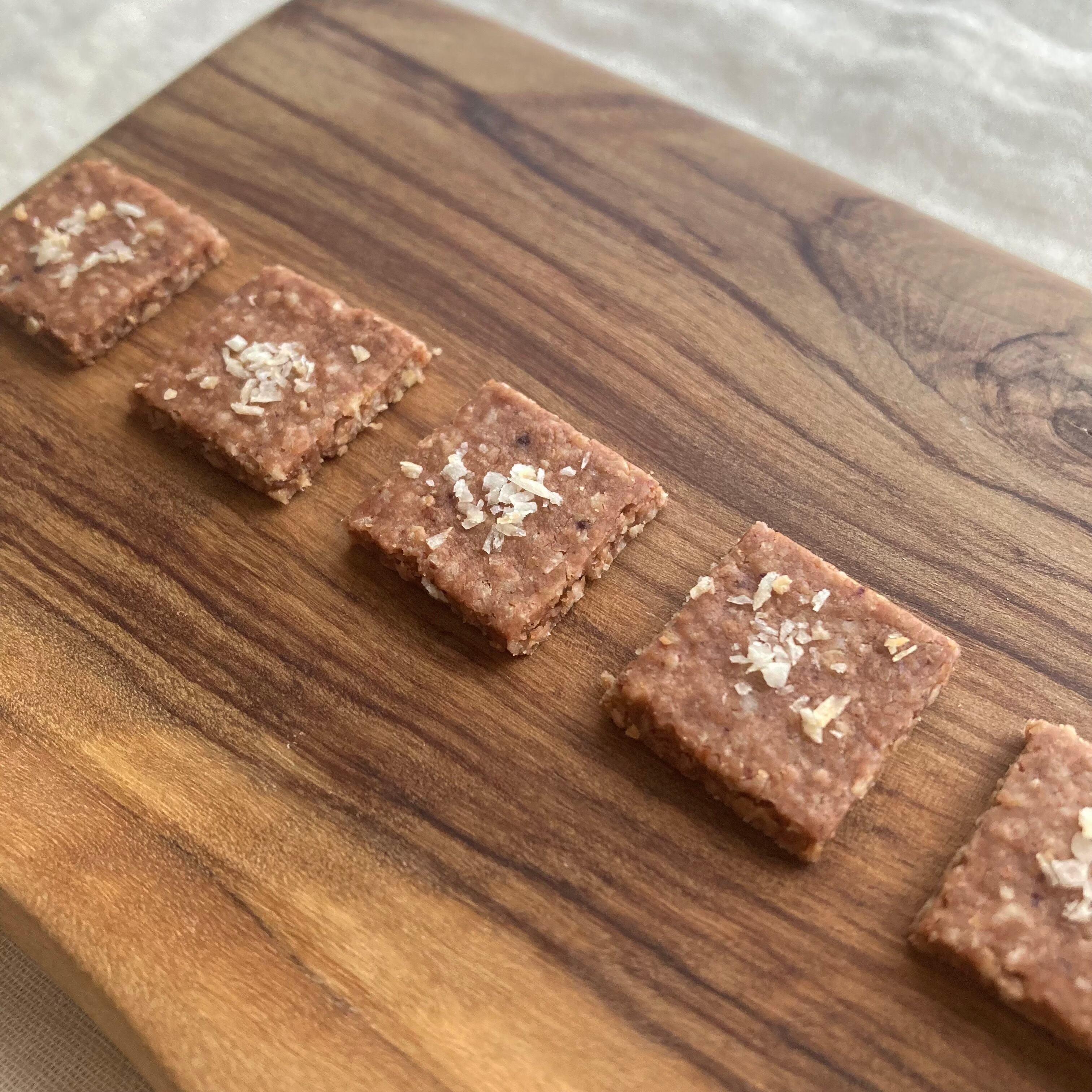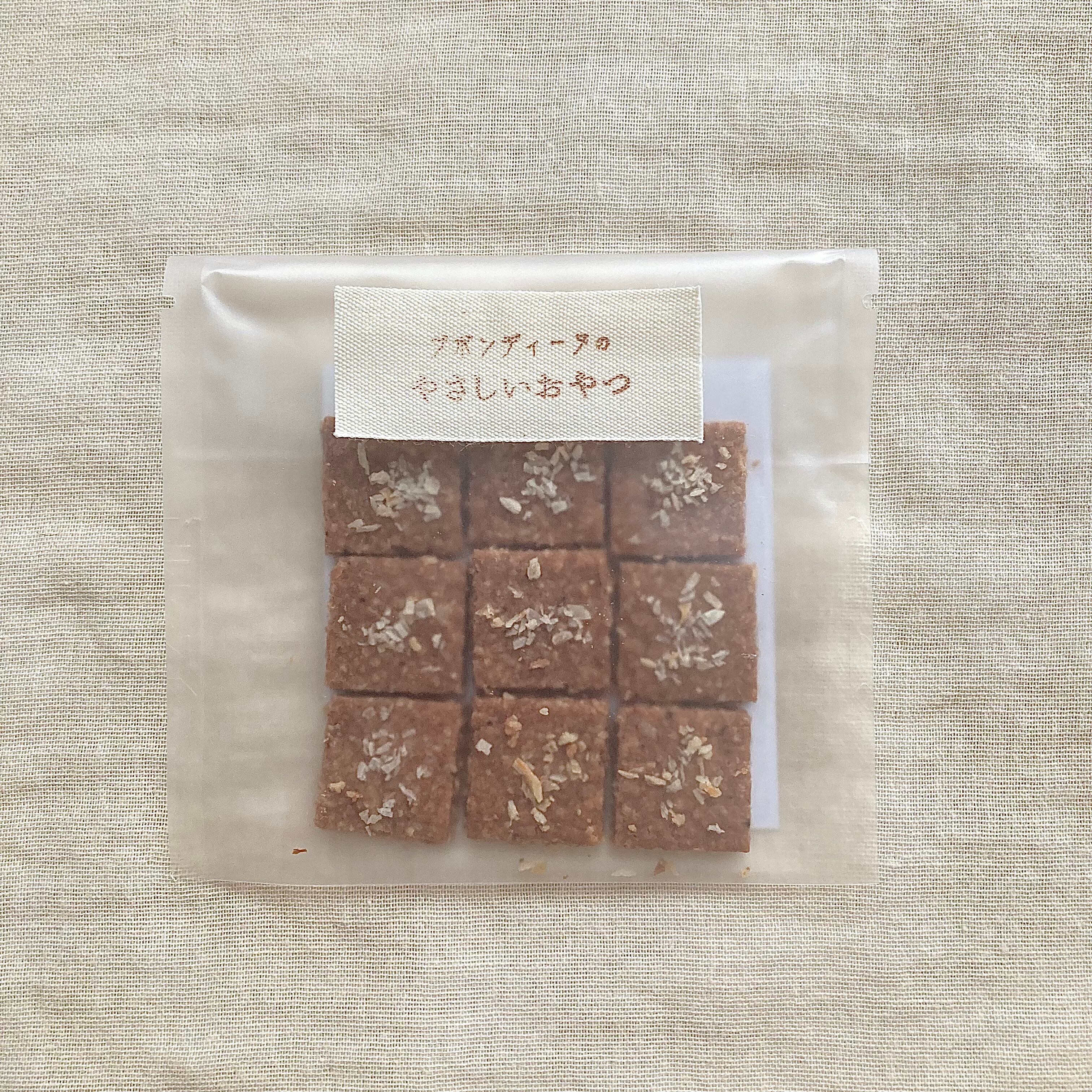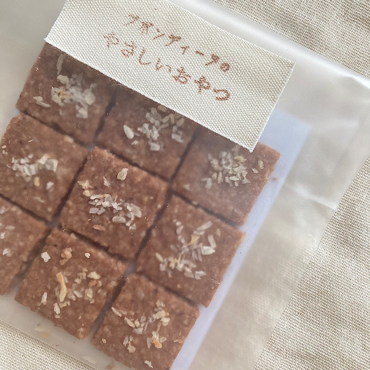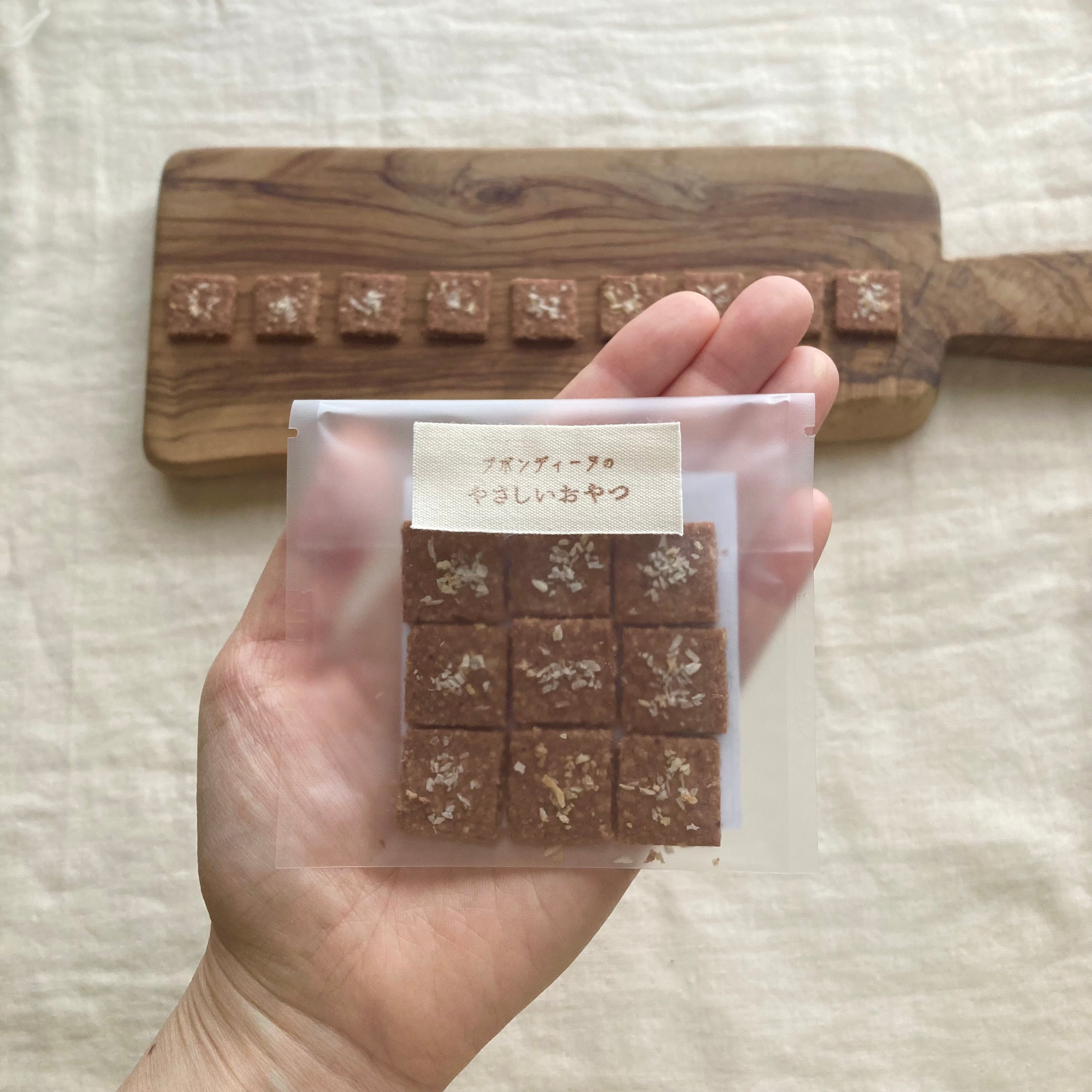 【原材料名】:栽培期間中農薬不使用米粉(米(福岡県産))、有機オートミール(アメリカ産)、有機ココナッツ(スリランカ産)、有機ココナッツオイル(フィリピン産)、有機片栗粉(北海道)、有機アーモンドプードル(アメリカ産)、菜種油(農薬不使用菜種(熊本県産)、有機ココア(ペルー産)、自然海塩(長崎県五島列島)、(一部にアーモンドを含む)