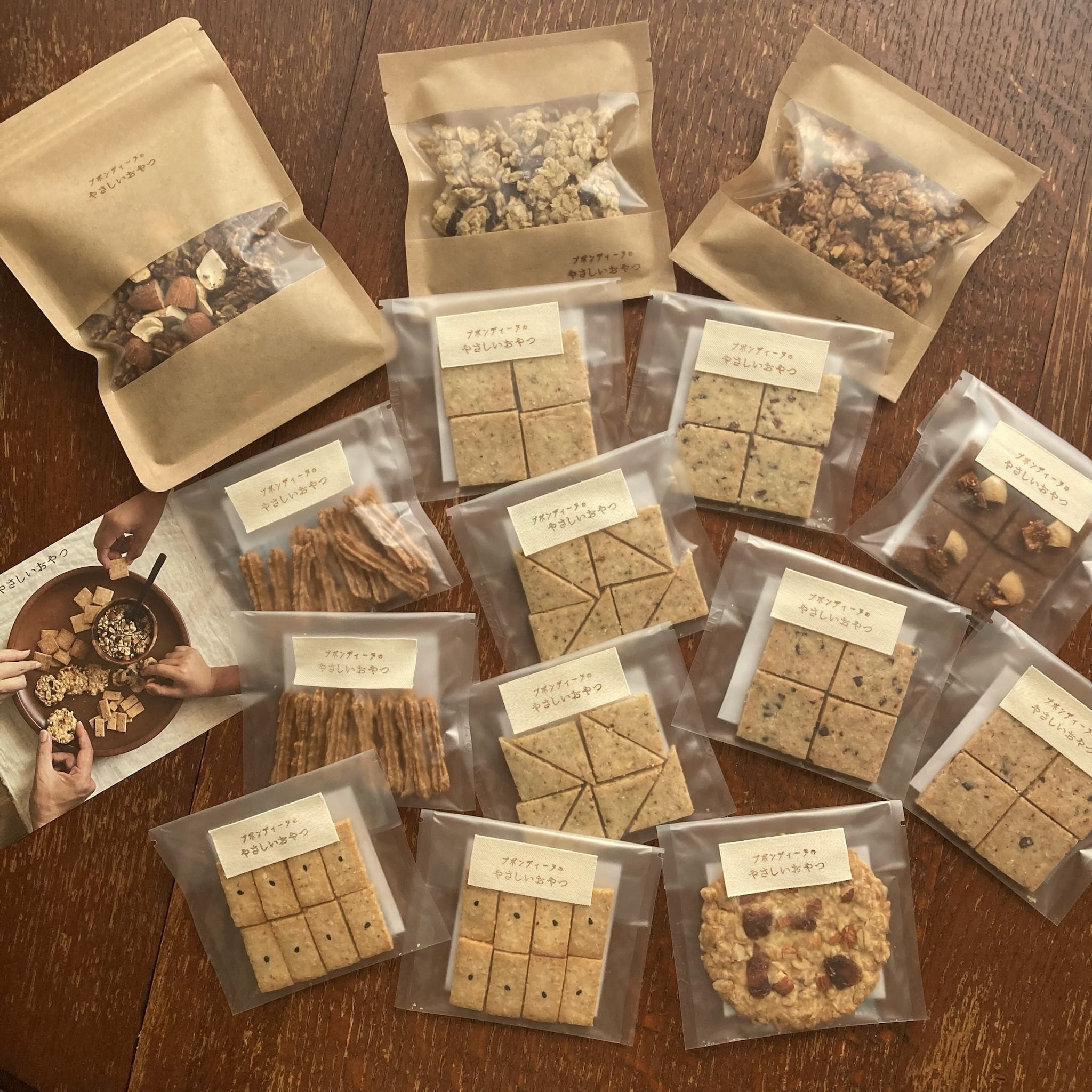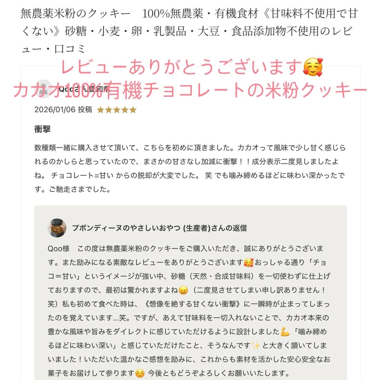 【原材料名】:栽培期間中農薬不使用米粉(米(福岡県産))、有機オートミール(オーツ麦(アメリカ産))、有機片栗粉(北海道産)、有機アーモンドプードル(アメリカ産)、有機ココナッツオイル(フィリピン産)、菜種油(農薬不使用菜種(熊本県産))、有機チョコレート(アリバ種カカオ100%)(エクアドル製造)、自然海塩(長崎県五島列島)、(一部にアーモンドを含む)